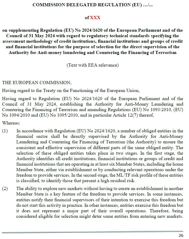 Zweck: Festlegung von Schwellenwerten und Methodik zur Auswahl von Instituten, die aufgrund ihrer grenzüberschreitenden Tätigkeit und ihres Risikoprofils unter die direkte Aufsicht der AMLA fallen sollen.